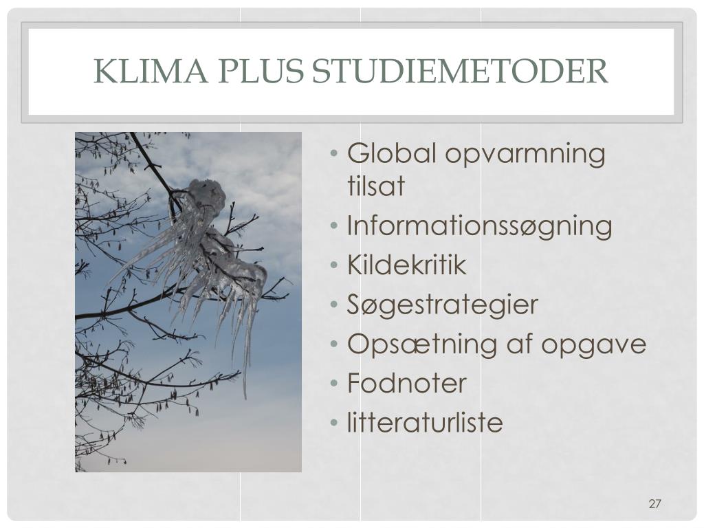Klima plus studiemetoder • Global opvarmning tilsat • Informationssøgning • Kildekritik • Søgestrategier • Opsætning af opgave • Fodnoter • litteraturliste