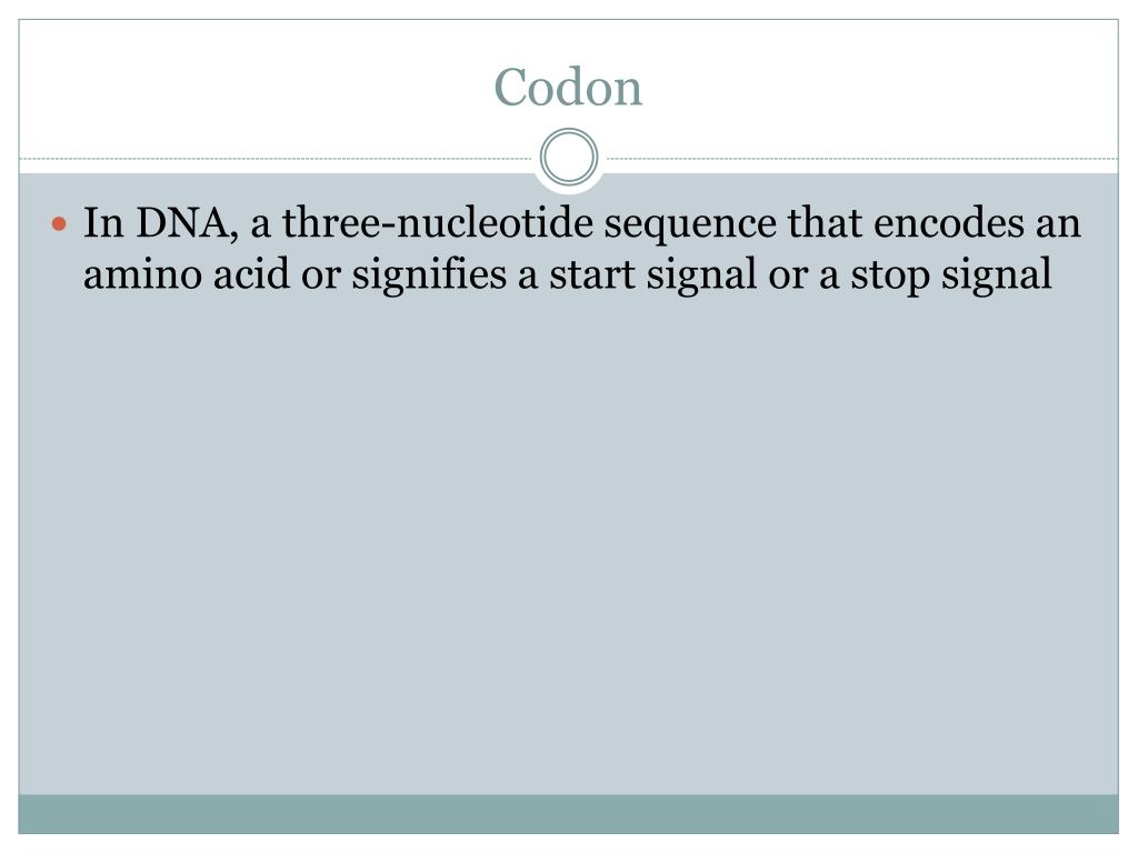 Codon In DNA, a three-nucleotide sequence that encodes an amino acid or signifies a start signal or a stop signal