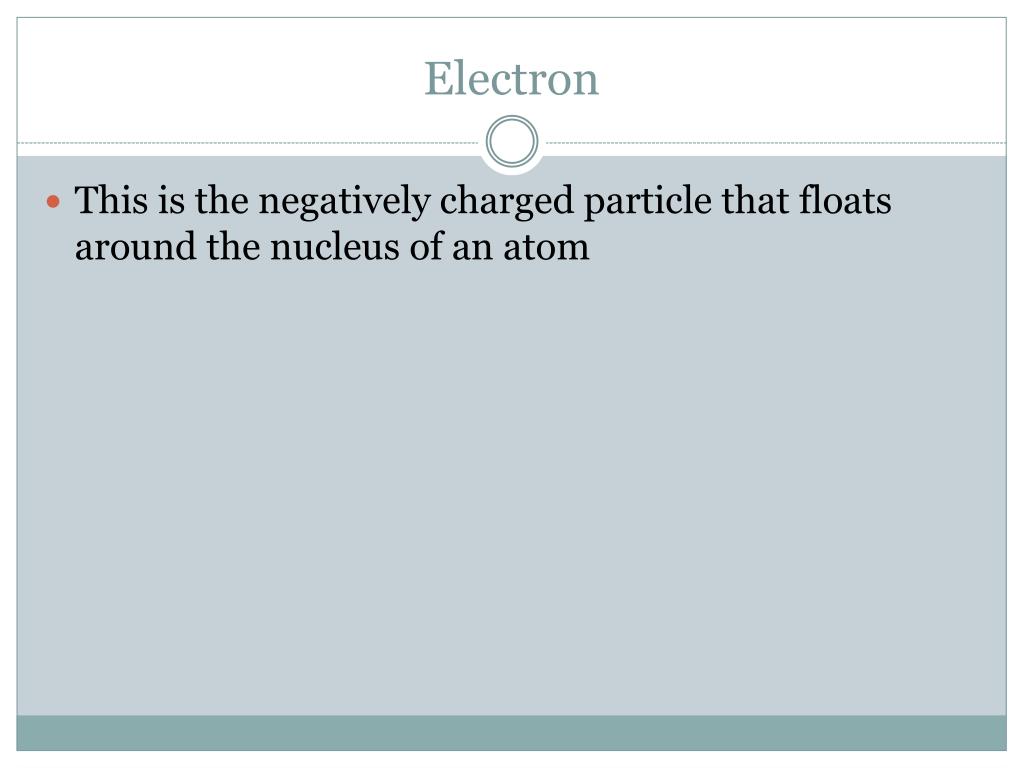 Electron This is the negatively charged particle that floats around the nucleus of an atom