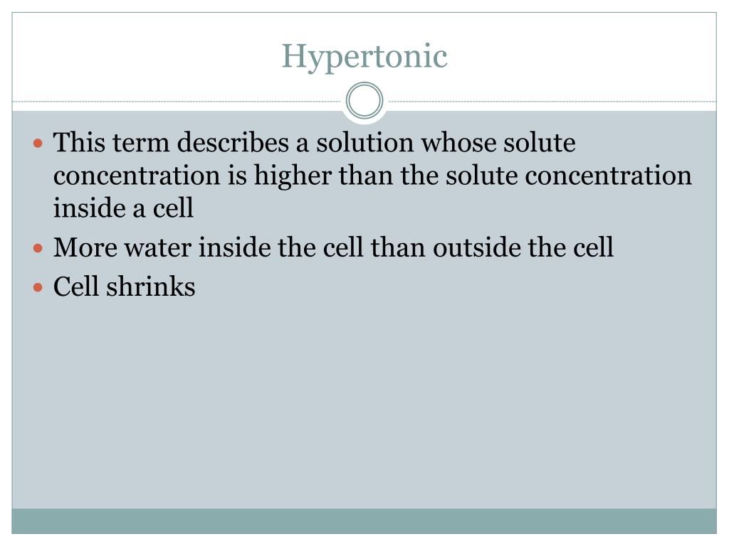 Hypertonic This term describes a solution whose solute concentration is higher than the solute concentration inside a cell More water inside the cell than outside the cell Cell shrinks
