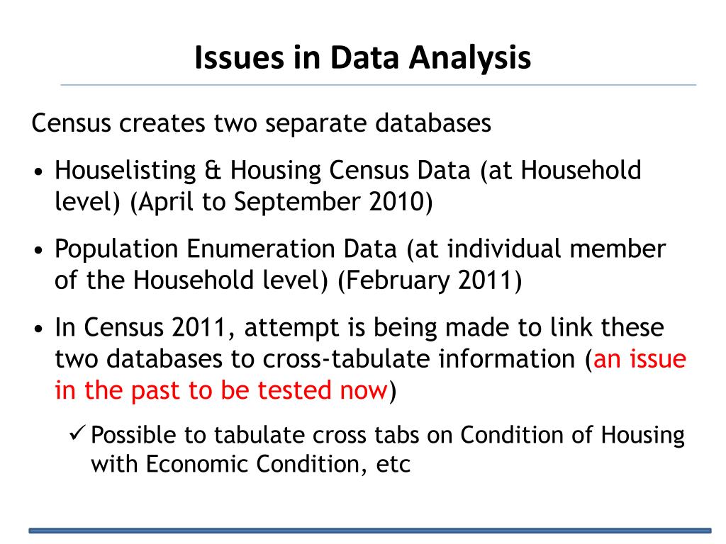 Issues in Data Analysis • Census creates two separate databases • Houselisting & Housing Census Data (at Household level) (April to September 2010) • Population Enumeration Data (at individual member of the Household level) (February 2011) • In Census 2011, attempt is being made to link these two databases to cross-tabulate information (an issue in the past to be tested now) • Possible to tabulate cross tabs on Condition of Housing with Economic Condition, etc