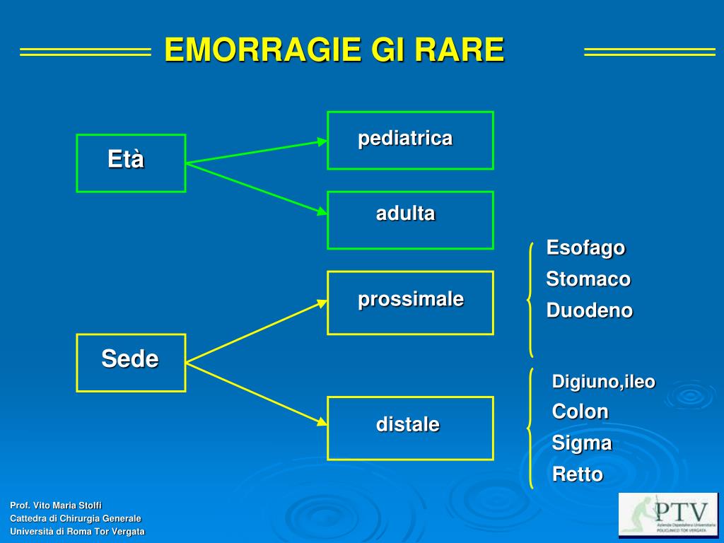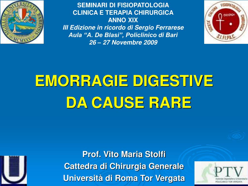 SEMINARI DI FISIOPATOLOGIA CLINICA E TERAPIA CHIRURGICA ANNO XIX III Edizione in ricordo di Sergio Ferrarese Aula “A. De Blasi”, Policlinico di Bari 26 – 27 Novembre 2009 EMORRAGIE DIGESTIVE DA CAUSE RARE Prof. Vito Maria Stolfi Cattedra di Chirurgia Generale Università di Roma Tor Vergata