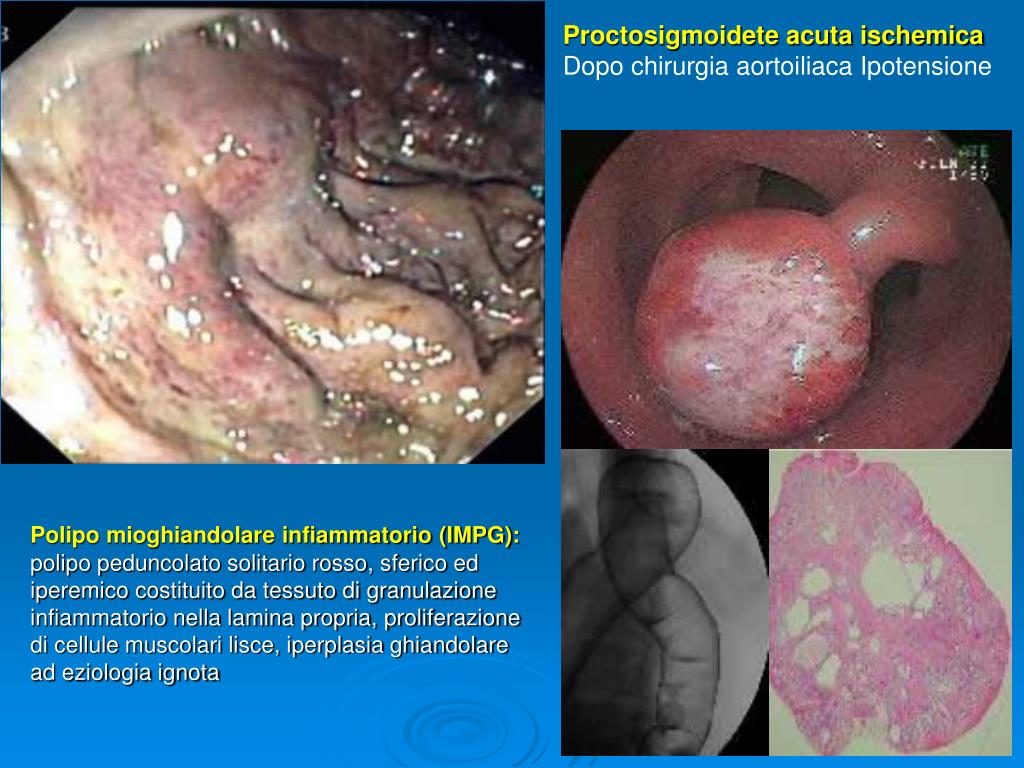 Proctosigmoidete acuta ischemica Dopo chirurgia aortoiliaca Ipotensione Polipo mioghiandolare infiammatorio (IMPG):polipo peduncolato solitario rosso, sferico ed iperemico costituito da tessuto di granulazione infiammatorio nella lamina propria, proliferazione di cellule muscolari lisce, iperplasia ghiandolare ad eziologia ignota