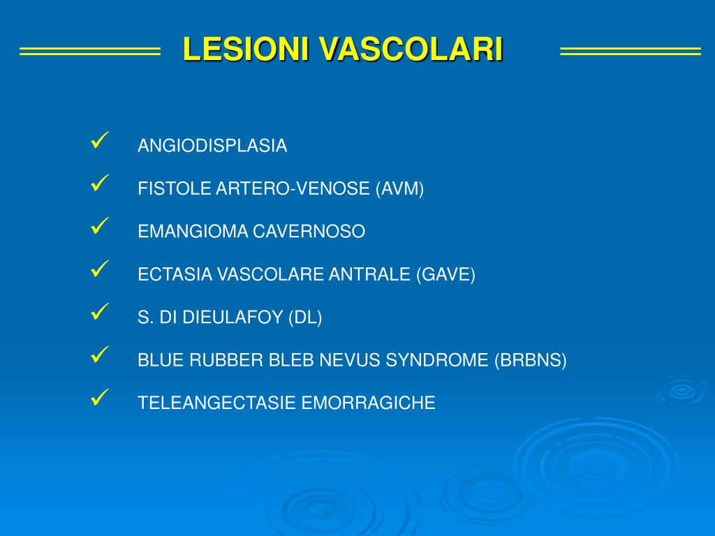 LESIONI VASCOLARI • ANGIODISPLASIA • FISTOLE ARTERO-VENOSE (AVM) • EMANGIOMA CAVERNOSO • ECTASIA VASCOLARE ANTRALE (GAVE) • S. DI DIEULAFOY (DL) • BLUE RUBBER BLEB NEVUS SYNDROME (BRBNS) • TELEANGECTASIE EMORRAGICHE