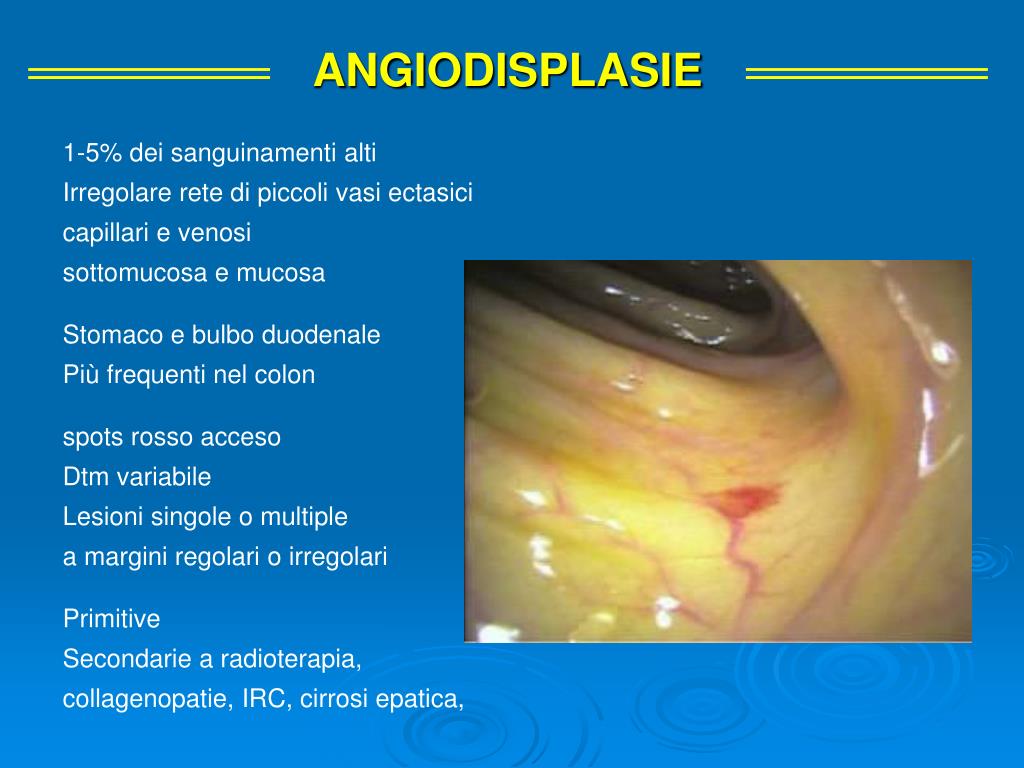 ANGIODISPLASIE 1-5% dei sanguinamenti alti Irregolare rete di piccoli vasi ectasici capillari e venosi sottomucosa e mucosa Stomaco e bulbo duodenale Più frequenti nel colon spots rosso acceso Dtm variabile Lesioni singole o multiple a margini regolari o irregolari Primitive Secondarie a radioterapia, collagenopatie, IRC, cirrosi epatica,