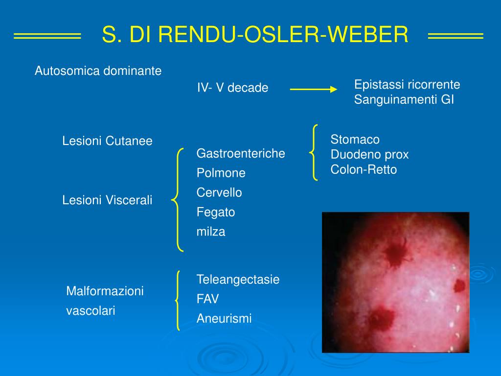 S. DI RENDU-OSLER-WEBER Autosomica dominante Epistassi ricorrente Sanguinamenti GI IV- V decade Lesioni Cutanee Stomaco Duodeno prox Colon-Retto Gastroenteriche Polmone Cervello Fegato milza Lesioni Viscerali Teleangectasie FAV Aneurismi Malformazioni vascolari