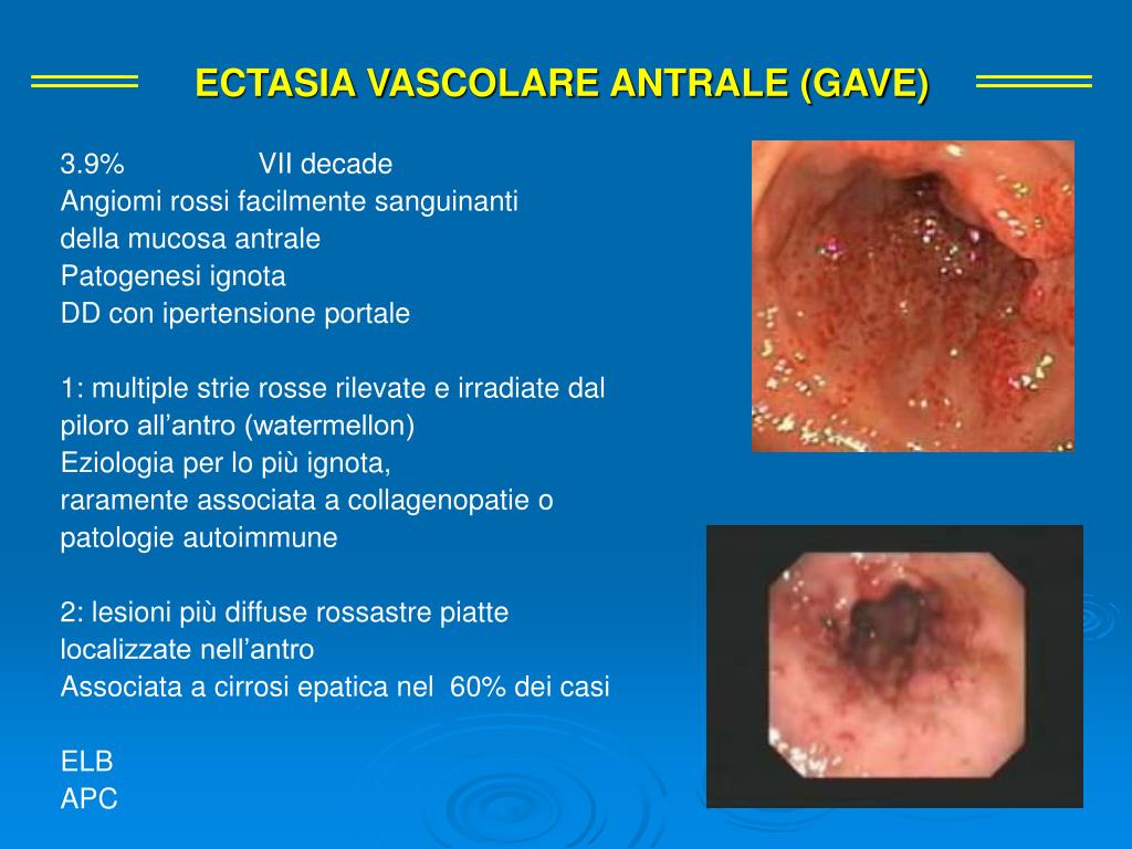 ECTASIA VASCOLARE ANTRALE (GAVE) 3.9% VII decade Angiomi rossi facilmente sanguinanti della mucosa antrale Patogenesi ignota DD con ipertensione portale 1: multiple strie rosse rilevate e irradiate dal piloro all’antro (watermellon) Eziologia per lo più ignota, raramente associata a collagenopatie o patologie autoimmune 2: lesioni più diffuse rossastre piatte localizzate nell’antro Associata a cirrosi epatica nel 60% dei casi ELB APC