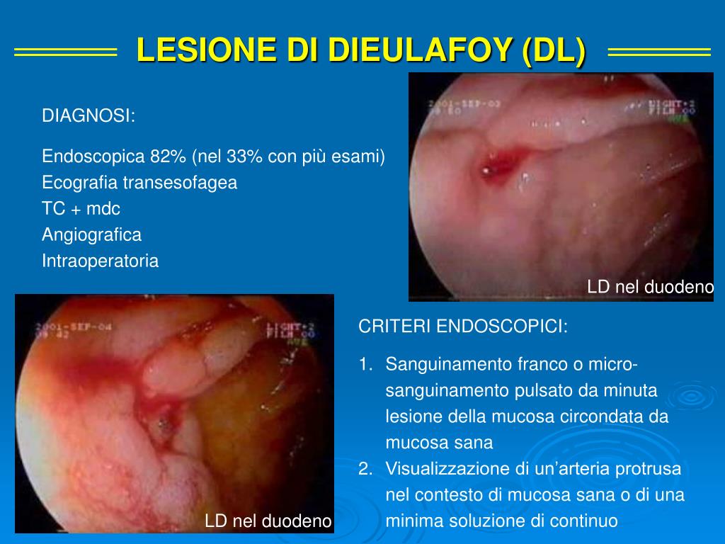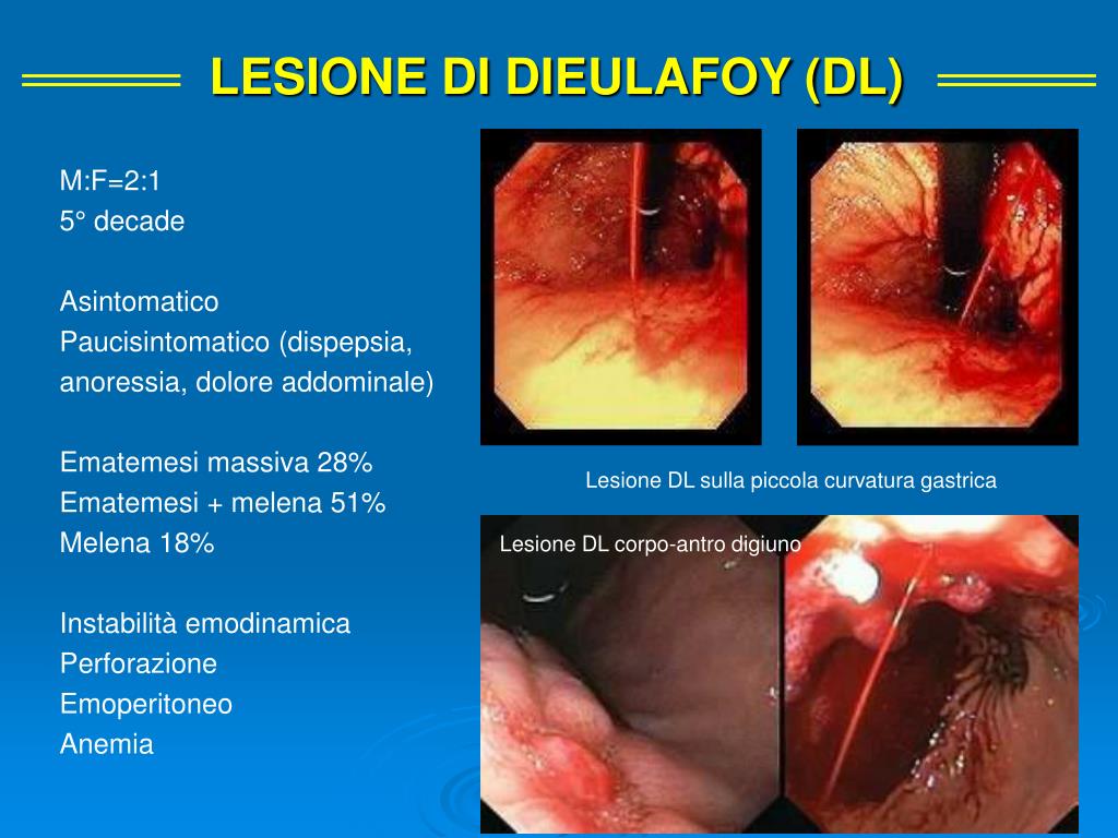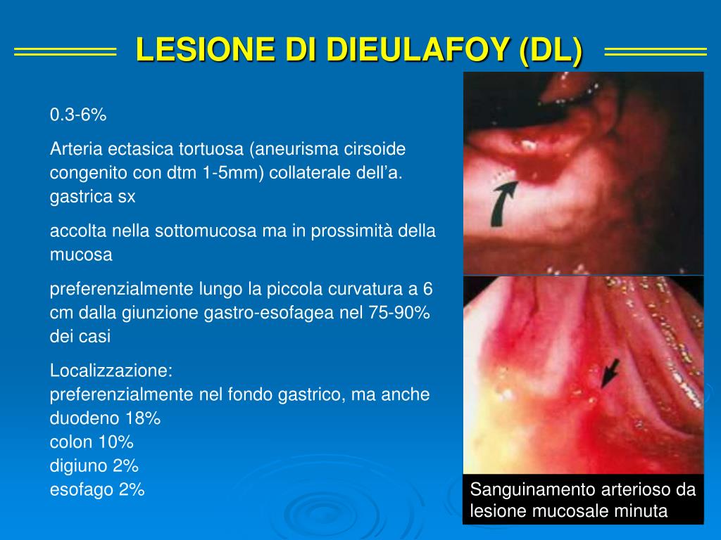 LESIONE DI DIEULAFOY (DL) 0.3-6% Arteria ectasica tortuosa (aneurisma cirsoide congenito con dtm 1-5mm) collaterale dell’a. gastrica sx accolta nella sottomucosa ma in prossimità della mucosa preferenzialmente lungo la piccola curvatura a 6 cm dalla giunzione gastro-esofagea nel 75-90% dei casi Localizzazione: preferenzialmente nel fondo gastrico, ma anche duodeno 18% colon 10% digiuno 2% esofago 2% Sanguinamento arterioso da lesione mucosale minuta
