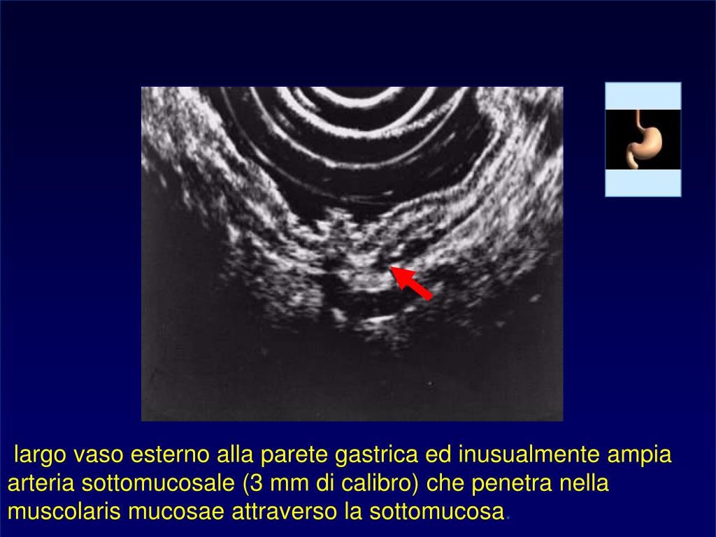 largo vaso esterno alla parete gastrica ed inusualmente ampia arteria sottomucosale (3 mm di calibro) che penetra nella muscolaris mucosae attraverso la sottomucosa.