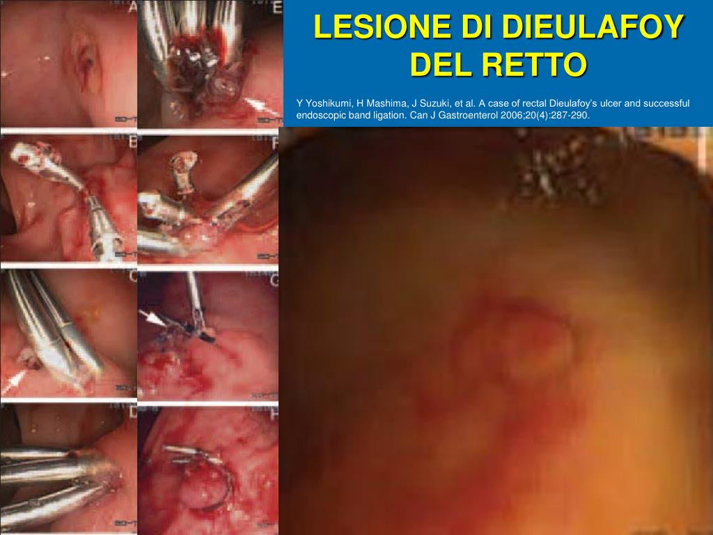 LESIONE DI DIEULAFOY DEL RETTO Y Yoshikumi, H Mashima, J Suzuki, et al. A case of rectal Dieulafoy’s ulcer and successful endoscopic band ligation. Can J Gastroenterol 2006;20(4):287-290.