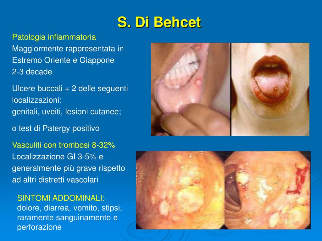 S. Di Behcet Patologia infiammatoria Maggiormente rappresentata in Estremo Oriente e Giappone 2-3 decade Ulcere buccali + 2 delle seguenti localizzazioni: genitali, uveiti, lesioni cutanee; o test di Patergy positivo Vasculiti con trombosi 8-32% Localizzazione GI 3-5% e generalmente più grave rispetto ad altri distretti vascolari SINTOMI ADDOMINALI: dolore, diarrea, vomito, stipsi, raramente sanguinamento e perforazione