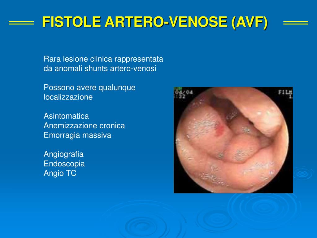 FISTOLE ARTERO-VENOSE (AVF) Rara lesione clinica rappresentata da anomali shunts artero-venosi Possono avere qualunque localizzazione Asintomatica Anemizzazione cronica Emorragia massiva Angiografia Endoscopia Angio TC