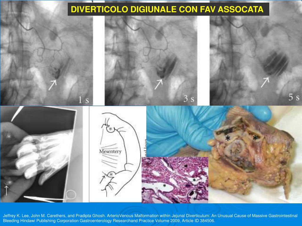 DIVERTICOLO DIGIUNALE CON FAV ASSOCATA Jeffrey K. Lee, John M. Carethers, and Pradipta Ghosh. ArterioVenous Malformation within Jejunal Diverticulum: An Unusual Cause of Massive Gastrointestinal Bleeding Hindawi Publishing Corporation Gastroenterology Researchand Practice Volume 2009, Article ID 384506.