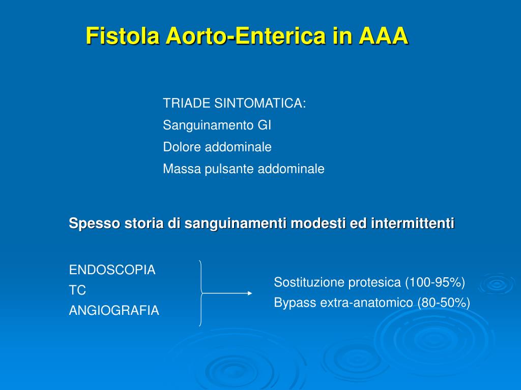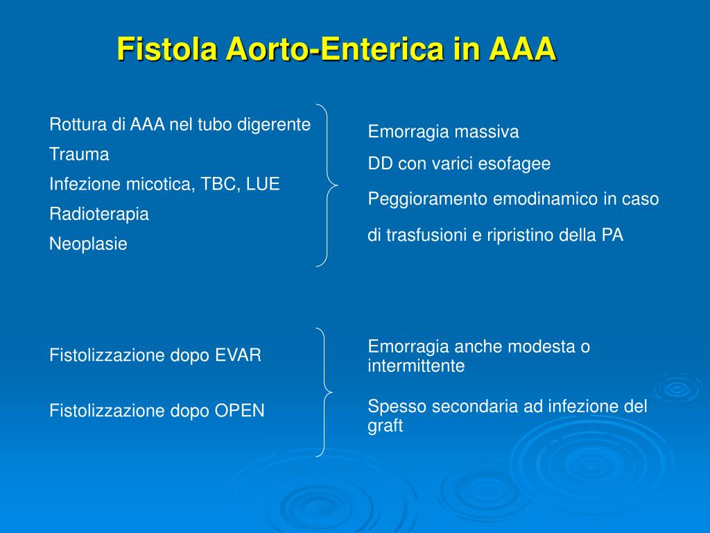 Fistola Aorto-Enterica in AAA Rottura di AAA nel tubo digerente Trauma Infezione micotica, TBC, LUE Radioterapia Neoplasie Fistolizzazione dopo EVAR Fistolizzazione dopo OPEN Emorragia massiva DD con varici esofagee Peggioramento emodinamico in caso di trasfusioni e ripristino della PA Emorragia anche modesta o intermittente Spesso secondaria ad infezione del graft