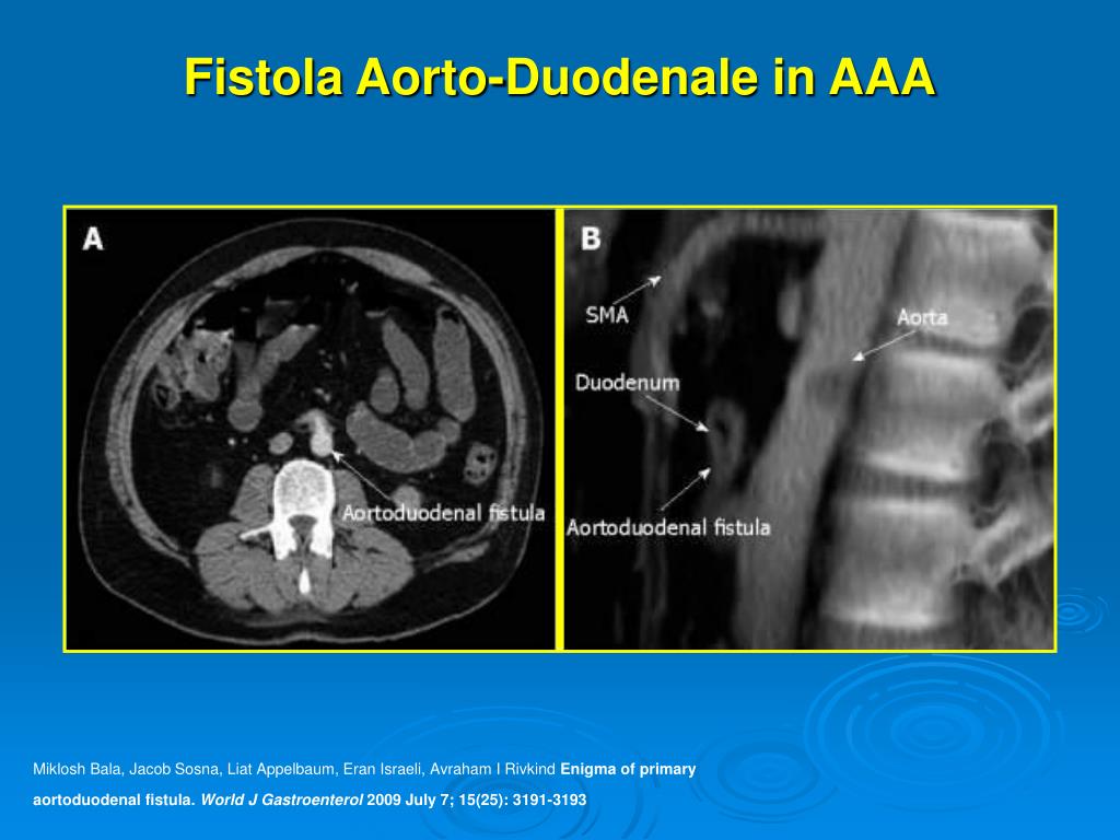 Fistola Aorto-Duodenale in AAA Miklosh Bala, Jacob Sosna, Liat Appelbaum, Eran Israeli, Avraham I Rivkind Enigma of primary aortoduodenal fistula. World J Gastroenterol 2009 July 7; 15(25): 3191-3193