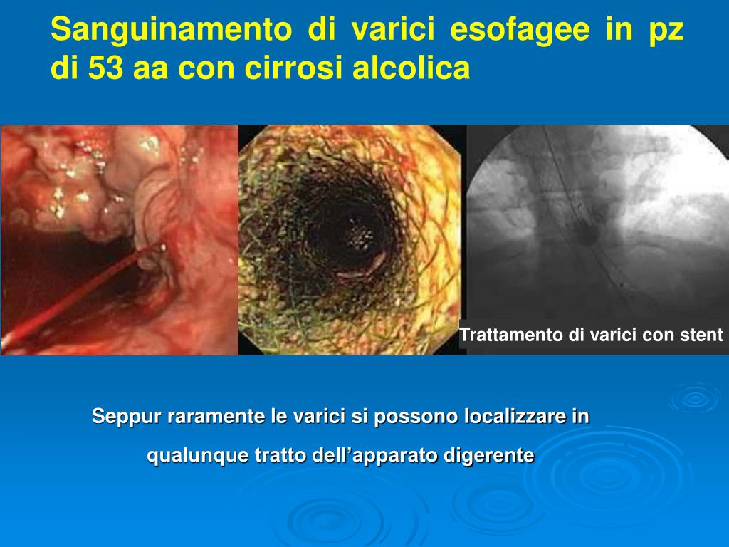 Sanguinamento di varici esofagee in pz di 53 aa con cirrosi alcolica Trattamento di varici con stent Seppur raramente le varici si possono localizzare in qualunque tratto dell’apparato digerente
