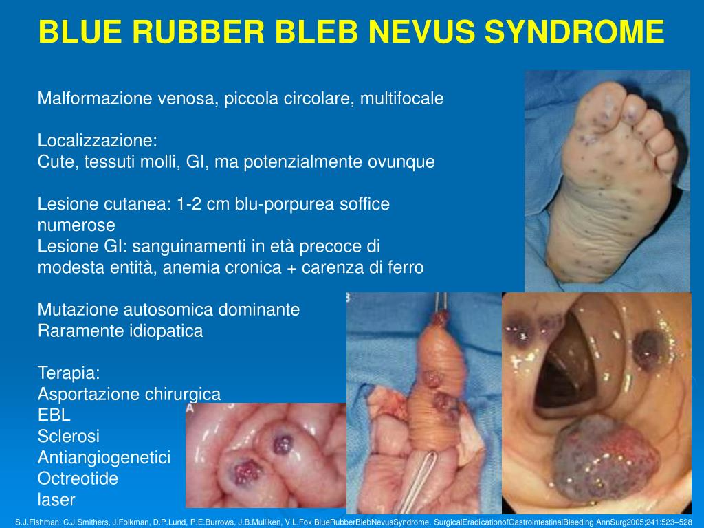 BLUE RUBBER BLEB NEVUS SYNDROME Malformazione venosa, piccola circolare, multifocale Localizzazione: Cute, tessuti molli, GI, ma potenzialmente ovunque Lesione cutanea: 1-2 cm blu-porpurea soffice numerose Lesione GI: sanguinamenti in età precoce di modesta entità, anemia cronica + carenza di ferro Mutazione autosomica dominante Raramente idiopatica Terapia: Asportazione chirurgica EBL Sclerosi Antiangiogenetici Octreotide laser S.J.Fishman, C.J.Smithers, J.Folkman, D.P.Lund, P.E.Burrows, J.B.Mulliken, V.L.Fox BlueRubberBlebNevusSyndrome. SurgicalEradicationofGastrointestinalBleeding AnnSurg2005;241:523–528