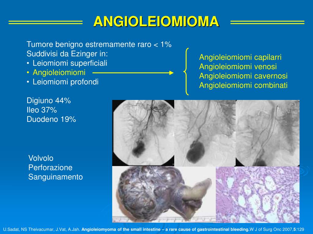 ANGIOLEIOMIOMA • Tumore benigno estremamente raro < 1% • Suddivisi da Ezinger in: • Leiomiomi superficiali • Angioleiomiomi • Leiomiomi profondi • Digiuno 44% • Ileo 37% • Duodeno 19% Angioleiomiomi capilarri Angioleiomiomi venosi Angioleiomiomi cavernosi Angioleiomiomi combinati Volvolo Perforazione Sanguinamento U.Sadat, NS Theivacumar, J.Vat, A.Jah. Angioleiomyoma of the small intestine – a rare cause of gastrointestinal bleeding.W J of Surg Onc 2007,5:129
