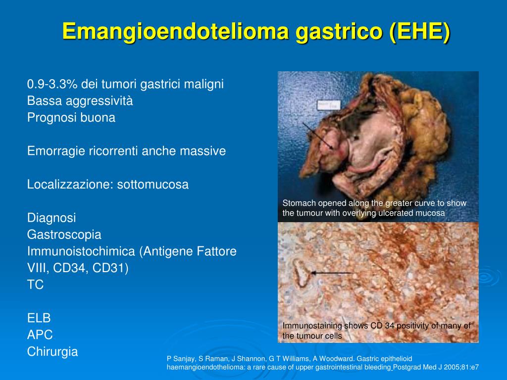 Emangioendotelioma gastrico (EHE) 0.9-3.3% dei tumori gastrici maligni Bassa aggressività Prognosi buona Emorragie ricorrenti anche massive Localizzazione: sottomucosa Diagnosi Gastroscopia Immunoistochimica (Antigene Fattore VIII, CD34, CD31) TC ELB APC Chirurgia Stomach opened along the greater curve to show the tumour with overlying ulcerated mucosa Immunostaining shows CD 34 positivity of many of the tumour cells P Sanjay, S Raman, J Shannon, G T Williams, A Woodward. Gastric epithelioid haemangioendothelioma: a rare cause of upper gastrointestinal bleedingPostgrad Med J 2005;81:e7