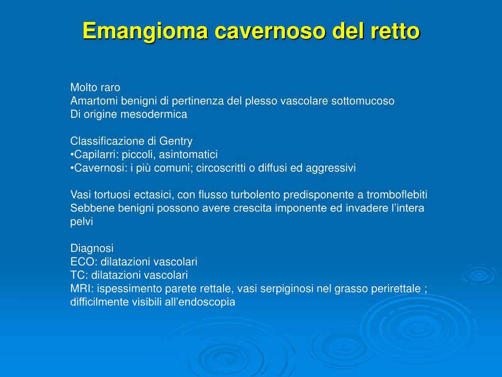 Emangioma cavernoso del retto • Molto raro • Amartomi benigni di pertinenza del plesso vascolare sottomucoso • Di origine mesodermica • Classificazione di Gentry • Capilarri: piccoli, asintomatici • Cavernosi: i più comuni; circoscritti o diffusi ed aggressivi • Vasi tortuosi ectasici, con flusso turbolento predisponente a tromboflebiti • Sebbene benigni possono avere crescita imponente ed invadere l’intera pelvi • Diagnosi • ECO: dilatazioni vascolari • TC: dilatazioni vascolari • MRI: ispessimento parete rettale, vasi serpiginosi nel grasso perirettale ; • difficilmente visibili all’endoscopia