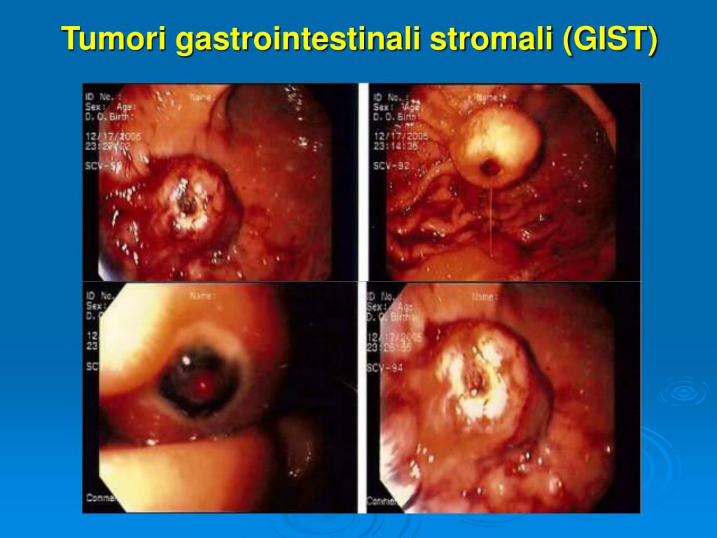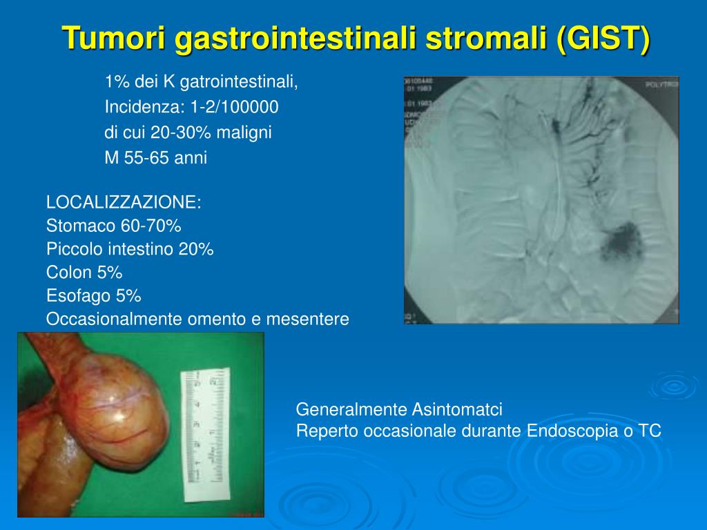 Tumori gastrointestinali stromali (GIST) 1% dei K gatrointestinali, Incidenza: 1-2/100000 di cui 20-30% maligni M 55-65 anni LOCALIZZAZIONE: Stomaco 60-70% Piccolo intestino 20% Colon 5% Esofago 5% Occasionalmente omento e mesentere Generalmente Asintomatci Reperto occasionale durante Endoscopia o TC