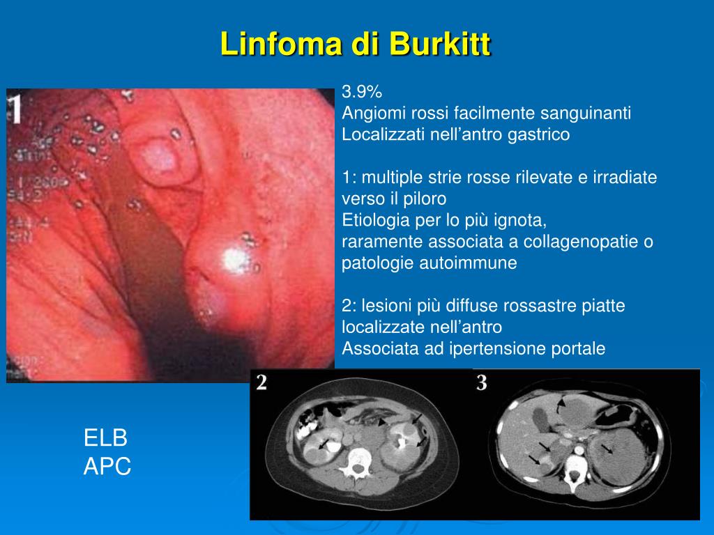 Linfoma di Burkitt 3.9% Angiomi rossi facilmente sanguinanti Localizzati nell’antro gastrico 1: multiple strie rosse rilevate e irradiate verso il piloro Etiologia per lo più ignota, raramente associata a collagenopatie o patologie autoimmune 2: lesioni più diffuse rossastre piatte localizzate nell’antro Associata ad ipertensione portale ELB APC