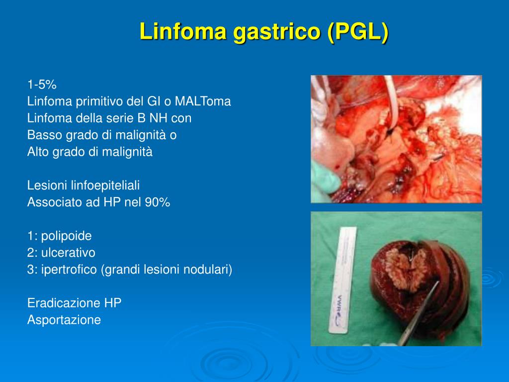 Linfoma gastrico (PGL) 1-5% Linfoma primitivo del GI o MALToma Linfoma della serie B NH con Basso grado di malignità o Alto grado di malignità Lesioni linfoepiteliali Associato ad HP nel 90% 1: polipoide 2: ulcerativo 3: ipertrofico (grandi lesioni nodulari) Eradicazione HP Asportazione