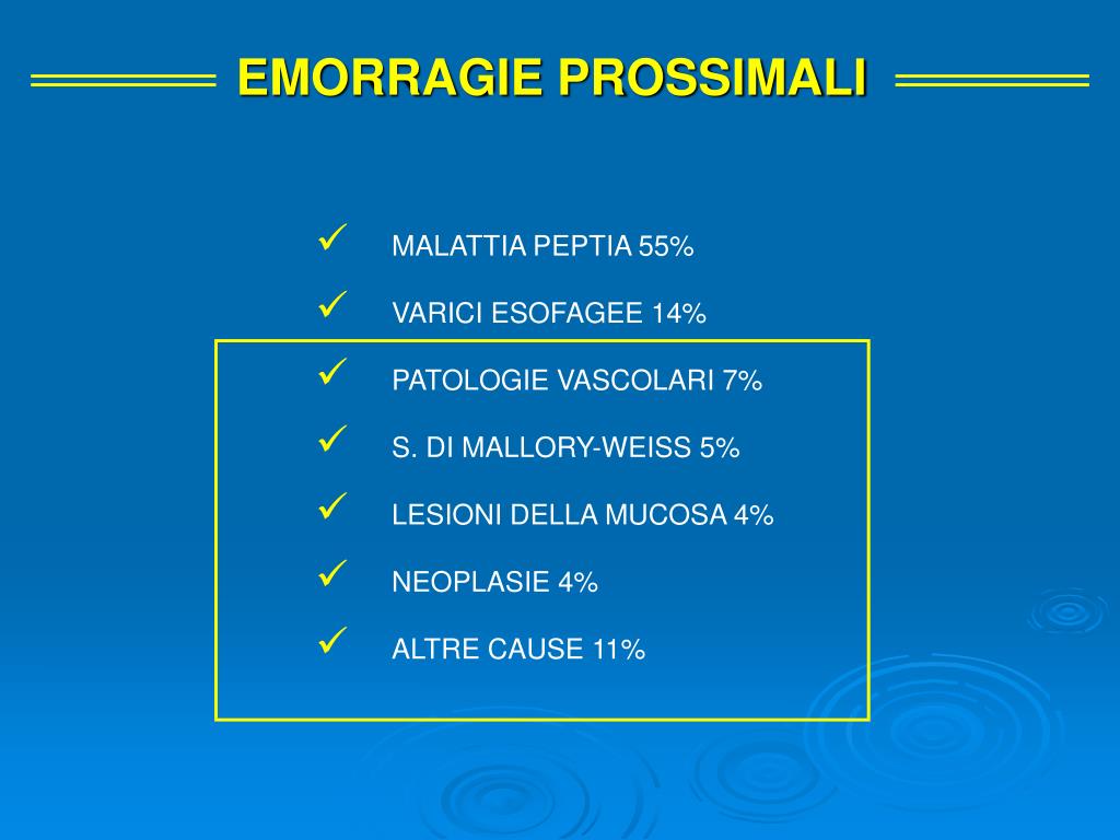 EMORRAGIE PROSSIMALI • MALATTIA PEPTIA 55% • VARICI ESOFAGEE 14% • PATOLOGIE VASCOLARI 7% • S. DI MALLORY-WEISS 5% • LESIONI DELLA MUCOSA 4% • NEOPLASIE 4% • ALTRE CAUSE 11%