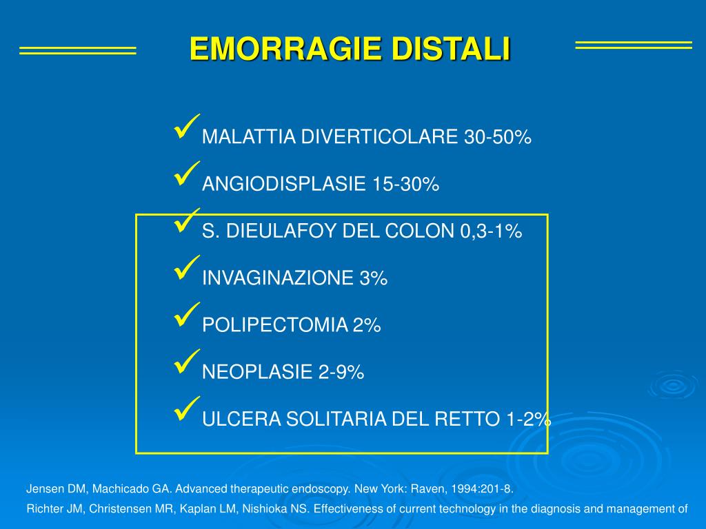 EMORRAGIE DISTALI • MALATTIA DIVERTICOLARE 30-50% • ANGIODISPLASIE 15-30% • S. DIEULAFOY DEL COLON 0,3-1% • INVAGINAZIONE 3% • POLIPECTOMIA 2% • NEOPLASIE 2-9% • ULCERA SOLITARIA DEL RETTO 1-2% Jensen DM, Machicado GA. Advanced therapeutic endoscopy. New York: Raven, 1994:201-8. Richter JM, Christensen MR, Kaplan LM, Nishioka NS. Effectiveness of current technology in the diagnosis and management of