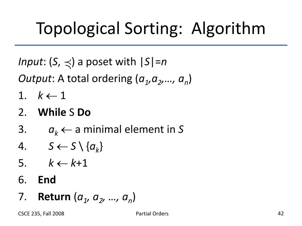 Topological Sorting: Algorithm Input: (S, p) a poset with |S|=n Output: A total ordering (a1,a2,…, an) • k 1 • While S Do • ak a minimal element in S • S S \{ak} • k k+1 • End • Return (a1, a2, …, an)