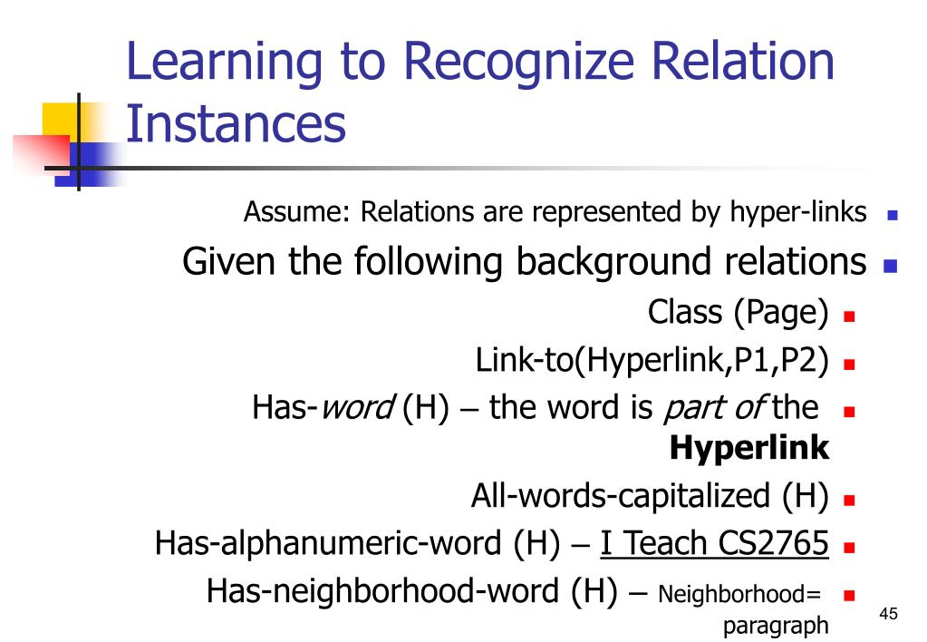 Learning to Recognize Relation Instances • Assume: Relations are represented by hyper-links • Given the following background relations • Class (Page) • Link-to(Hyperlink,P1,P2) • Has-word (H) – the word is part of the Hyperlink • All-words-capitalized (H) • Has-alphanumeric-word (H) –I Teach CS2765 • Has-neighborhood-word (H) –Neighborhood= paragraph