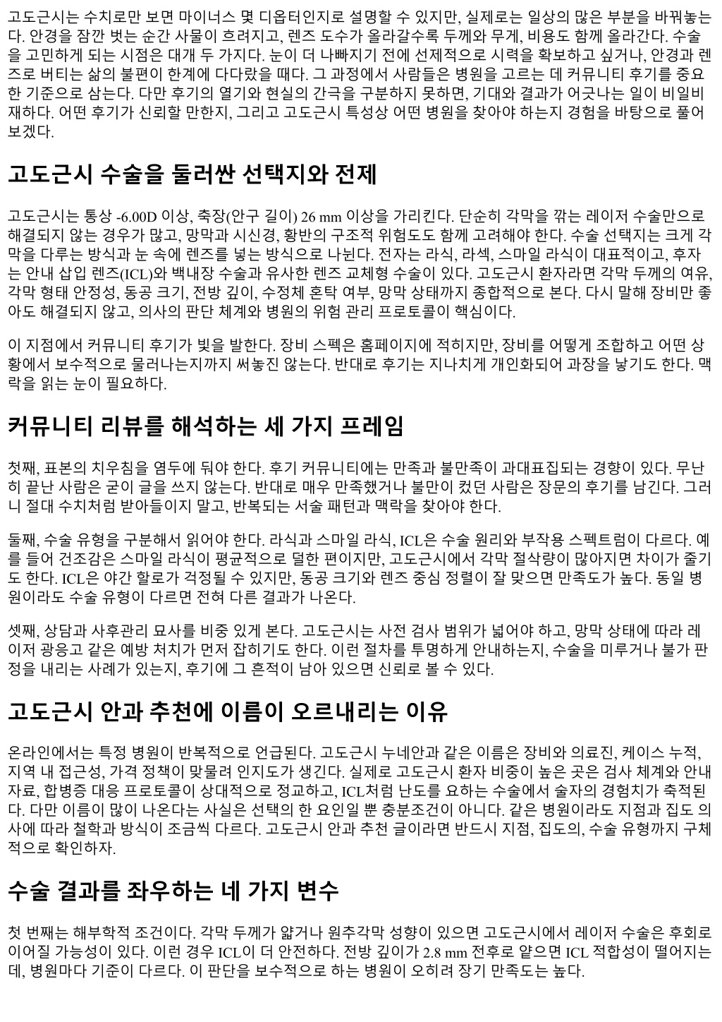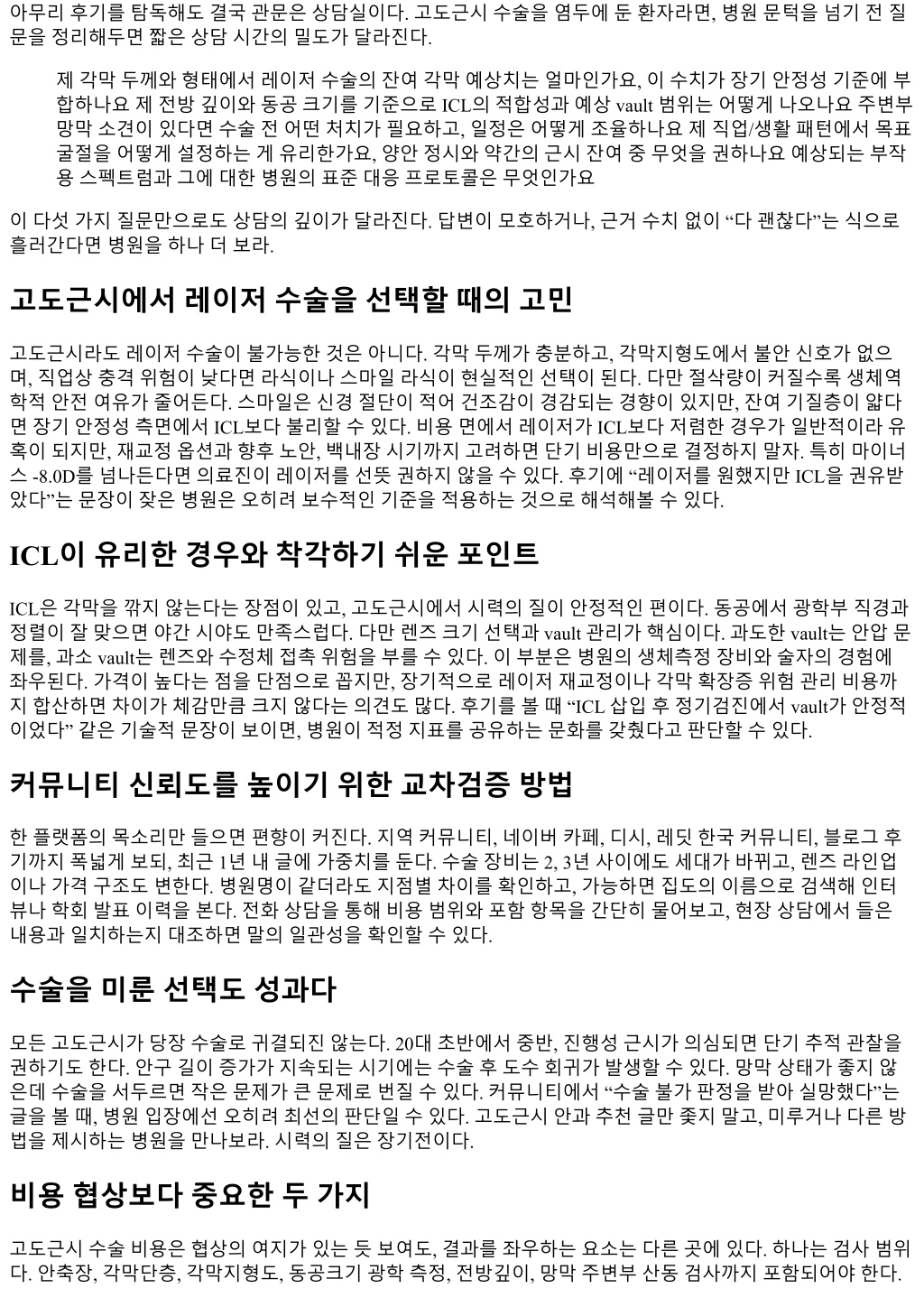 아무리후기를탐독해도결국관문은상담실이다. 고도근시수술을염두에둔환자라면, 병원문턱을넘기전질 문을정리해두면짧은상담시간의밀도가달라진다. 제각막두께와형태에서레이저수술의잔여각막예상치는얼마인가요, 이수치가장기안정성기준에부 합하나요제전방깊이와동공크기를기준으로 ICL의적합성과예상 vault 범위는어떻게나오나요주변부 망막소견이있다면수술전어떤처치가필요하고, 일정은어떻게조율하나요제직업/생활패턴에서목표 굴절을어떻게설정하는게유리한가요, 양안정시와약간의근시잔여중무엇을권하나요예상되는부작 용스펙트럼과그에대한병원의표준대응프로토콜은무엇인가요 이다섯가지질문만으로도상담의깊이가달라진다. 답변이모호하거나, 근거수치없이 “다괜찮다”는식으로 흘러간다면병원을하나더보라. 고도근시에서레이저수술을선택할때의고민 고도근시라도레이저수술이불가능한것은아니다. 각막두께가충분하고, 각막지형도에서불안신호가없으 며, 직업상충격위험이낮다면라식이나스마일라식이현실적인선택이된다. 다만절삭량이커질수록생체역 학적안전여유가줄어든다. 스마일은신경절단이적어건조감이경감되는경향이있지만, 잔여기질층이얇다 면장기안정성측면에서 ICL보다불리할수있다. 비용면에서레이저가 ICL보다저렴한경우가일반적이라유 혹이되지만, 재교정옵션과향후노안, 백내장시기까지고려하면단기비용만으로결정하지말자. 특히마이너 스 -8.0D를넘나든다면의료진이레이저를선뜻권하지않을수있다. 후기에 “레이저를원했지만 ICL을권유받 았다”는문장이잦은병원은오히려보수적인기준을적용하는것으로해석해볼수있다. ICL이유리한경우와착각하기쉬운포인트 ICL은각막을깎지않는다는장점이있고, 고도근시에서시력의질이안정적인편이다. 동공에서광학부직경과 정렬이잘맞으면야간시야도만족스럽다. 다만렌즈크기선택과 vault 관리가핵심이다. 과도한 vault는안압문 제를, 과소 vault는렌즈와수정체접촉위험을부를수있다. 이부분은병원의생체측정장비와술자의경험에 좌우된다. 가격이높다는점을단점으로꼽지만, 장기적으로레이저재교정이나각막확장증위험관리비용까 지합산하면차이가체감만큼크지않다는의견도많다. 후기를볼때 “ICL 삽입후정기검진에서 vault가안정적 이었다” 같은기술적문장이보이면, 병원이적정지표를공유하는문화를갖췄다고판단할수있다. 커뮤니티신뢰도를높이기위한교차검증방법 한플랫폼의목소리만들으면편향이커진다. 지역커뮤니티, 네이버카페, 디시, 레딧한국커뮤니티, 블로그후 기까지폭넓게보되, 최근 1년내글에가중치를둔다. 수술장비는 2, 3년사이에도세대가바뀌고, 렌즈라인업 이나가격구조도변한다. 병원명이같더라도지점별차이를확인하고, 가능하면집도의이름으로검색해인터 뷰나학회발표이력을본다. 전화상담을통해비용범위와포함항목을간단히물어보고, 현장상담에서들은 내용과일치하는지대조하면말의일관성을확인할수있다. 수술을미룬선택도성과다 모든고도근시가당장수술로귀결되진않는다. 20대초반에서중반, 진행성근시가의심되면단기추적관찰을 권하기도한다. 안구길이증가가지속되는시기에는수술후도수회귀가발생할수있다. 망막상태가좋지않 은데수술을서두르면작은문제가큰문제로번질수있다. 커뮤니티에서 “수술불가판정을받아실망했다”는 글을볼때, 병원입장에선오히려최선의판단일수있다. 고도근시안과추천글만좇지말고, 미루거나다른방 법을제시하는병원을만나보라. 시력의질은장기전이다. 비용협상보다중요한두가지 고도근시수술비용은협상의여지가있는듯보여도, 결과를좌우하는요소는다른곳에있다. 하나는검사범위 다. 안축장, 각막단층, 각막지형도, 동공크기광학측정, 전방깊이, 망막주변부산동검사까지포함되어야한다.