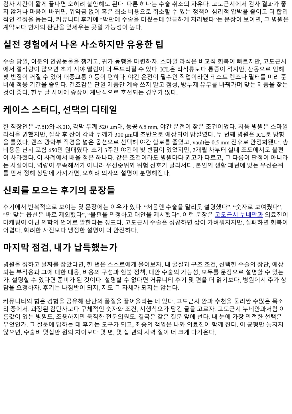 검사시간이짧게끝나면오히려불안해도된다. 다른하나는수술취소의자유다. 고도근시에서검사결과가좋 지않거나마음이바뀌면, 위약금없이혹은최소비용으로취소할수있는정책이심리적압박을줄이고더합리 적인결정을돕는다. 커뮤니티후기에 “막판에수술을미뤘는데깔끔하게처리됐다”는문장이보이면, 그병원은 계약보다환자의판단을앞세우는곳일가능성이높다. 실전경험에서나온사소하지만유용한팁 수술당일, 여분의인공눈물을챙기고, 귀가동행을마련하자. 스마일라식은비교적회복이빠르지만, 고도근시 에서절삭량이많으면초기시야떨림이더두드러질수있다. ICL은라식류보다통증이적지만, 산동으로인해 빛번짐이커질수있어대중교통이동이편하다. 야간운전이필수인직업이라면테스트렌즈나필터를미리준 비해적응기간을줄인다. 건조감은단일제품만계속쓰지말고점성, 방부제유무를바꿔가며맞는제품을찾는 것이좋다. 한두달사이에증상이계단식으로호전되는경우가많다. 케이스스터디, 선택의디테일 한직장인은 -7.5D와 -8.0D, 각막두께 520 μm대, 동공 6.5 mm, 야간운전이잦은조건이었다. 처음병원은스마일 라식을권했지만, 절삭후잔여각막두께가 300 μm대초반으로예상되어망설였다. 두번째병원은 ICL로방향 을틀었다. 렌즈광학부직경을넓은옵션으로선택해야간할로를줄였고, vault는 0.5 mm 전후로안정화됐다. 총 비용은난시포함 650만원대였다. 초기 3주간야간에빛번짐이있었지만, 2개월차부터실내조도에서도불편 이사라졌다. 이사례에서배울점은하나다. 같은조건이라도병원마다권고가다르고, 그다름이단점이아니라 는사실이다. 역량이부족해서가아니라우선순위와위험선호가달라서다. 본인의생활패턴에맞는우선순위 를먼저정해상담에가져가면, 오히려의사의설명이분명해진다. 신뢰를모으는후기의문장들 후기에서반복적으로보이는몇문장에는이유가있다. “처음엔수술을말리듯설명했다”, “숫자로보여줬다”, “안맞는옵션은바로제외했다”, “불편을인정하고대안을제시했다”. 이런문장은고도근시누네안과의료진이 마케팅이아닌의학의언어로말한다는징표다. 고도근시수술은성공하면삶이가벼워지지만, 실패하면회복이 어렵다. 화려한사진보다냉정한설명이더안전하다. 마지막점검, 내가납득했는가 병원을정하고날짜를잡았다면, 한번은스스로에게물어보자. 내굴절과구조조건, 선택한수술의장단, 예상 되는부작용과그에대한대응, 비용의구성과환불정책, 대안수술의가능성, 모두를문장으로설명할수있는 가. 설명할수있다면준비가된것이다. 설명할수없다면커뮤니티후기몇편을더읽기보다, 병원에서추가상 담을요청하자. 후기는나침반이되지, 지도그자체가되지는않는다. 커뮤니티의힘은경험을공유해판단의품질을끌어올리는데있다. 고도근시안과추천을둘러싼수많은목소 리중에서, 과장된감탄사보다구체적인숫자와조건, 시행착오가담긴글을고르자. 고도근시누네안과처럼이 름값이있는병원도, 조용하지만묵직한전문의원도, 결국은같은질문앞에선다. 내눈에가장안전한선택은 무엇인가. 그질문에답하는데후기는도구가되고, 최종의책임은나와의료진이함께진다. 이균형만놓치지 않으면, 수술비몇십만원의차이보다몇년, 몇십년의시력질이더크게다가온다.