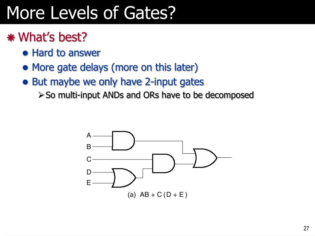 More Levels of Gates? • What’s best? • Hard to answer • More gate delays (more on this later) • But maybe we only have 2-input gates • So multi-input ANDs and ORs have to be decomposed