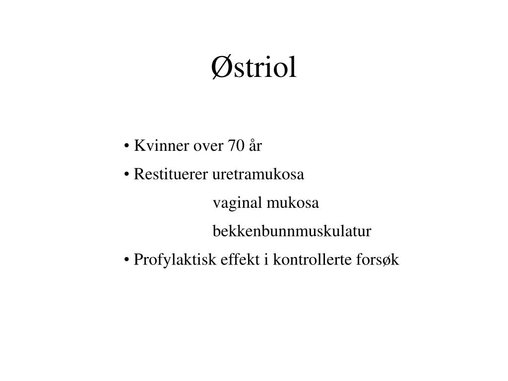 Østriol • Kvinner over 70 år • Restituerer uretramukosa • vaginal mukosa • bekkenbunnmuskulatur • Profylaktisk effekt i kontrollerte forsøk