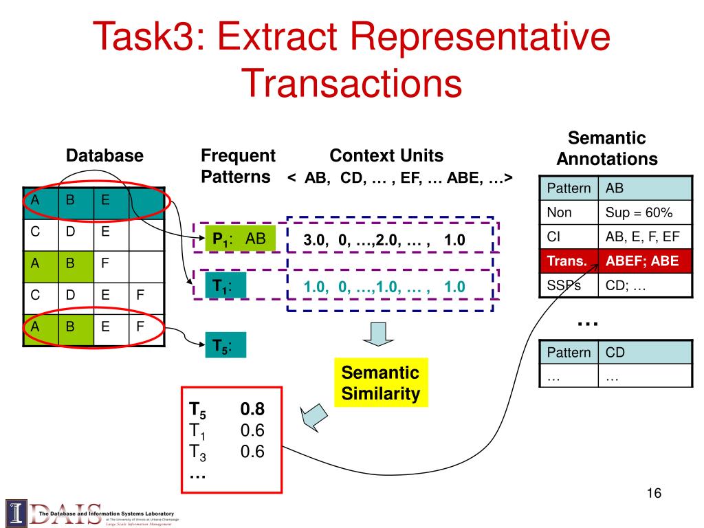 T1: 1.0, 0, …,1.0, … , 1.0 T5: Semantic Similarity T5 0.8T1 0.6T3 0.6… Task3: Extract Representative Transactions Semantic Annotations Database Frequent Patterns Context Units < AB, CD, … , EF, … ABE, …> P1: AB 3.0, 0, …,2.0, … , 1.0 …