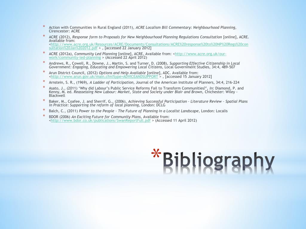 Action with Communities in Rural England (2011), ACRE Localism Bill Commentary: Neighbourhood Planning, Cirencester: ACRE • ACRE (2012), Response form to Proposals for New Neighbourhood Planning Regulations Consultation [online], ACRE. Available from: <http://www.acre.org.uk/Resources/ACRE/Documents/Consultations/ACRE%20response%20to%20NP%20Regs%20consultation%20Jan%202012.pdf > , [accessed 22 January 2012] • ACRE (2012a), Community Led Planning [online], ACRE, Available from: <http://www.acre.org.uk/our-work/community-led-planning > (Accessed 22 April 2012) • Andrews, R., Cowell, R., Downe, J., Martin, S. and Turner, D. (2008), Supporting Effective Citizenship in Local Government: Engaging, Educating and Empowering Local Citizens, Local Government Studies, 34:4, 489-507 • Arun District Council, (2012) Options and Help Available [online], ADC. Available from: <http://www.arun.gov.uk/main.cfm?type=ADVICEANDSUPPORT > , [accessed 15 January 2012] • Arnstein, S. R., (1969), A Ladder of Participation, Journal of the American Institute of Planners, 34:4, 216-224 • Asato, J., (2011) ‘Why did Labour’s Public Service Reforms Fail to Transform Communities?’, In: Diamond, P. and Kenny, M. ed. Reassessing New Labour: Market, State and Society under Blair and Brown, Chichester: Wiley - Blackwell • Baker, M., Coafee, J. and Sherrif, G., (2006), Achieving Successful Participation – Literature Review – Spatial Plans in Practice: Supporting the reform of local planning, London: DCLG • Balch, C., (2011) Power to the People – The Future of Planning in a Localist Landscape, London: Localis • BDOR (2006) An Exciting Future for Community Plans, Available from: <http://www.bdor.co.uk/publications/SwanReportFull.pdf > (Accessed 11 April 2012) Bibliography