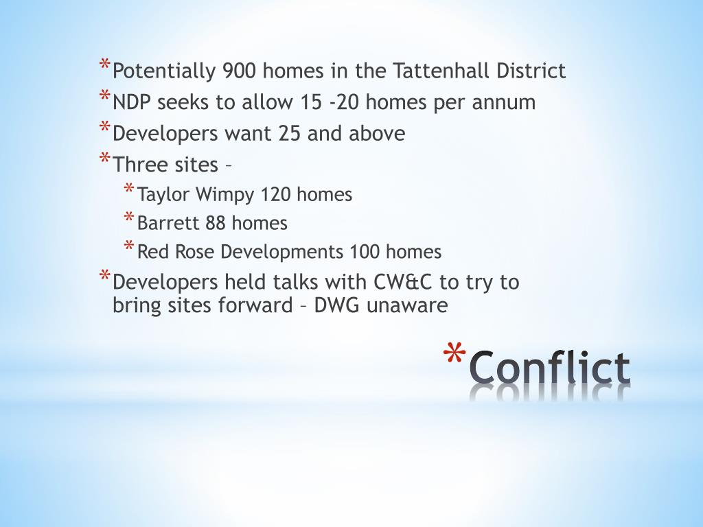 Potentially 900 homes in the Tattenhall District • NDP seeks to allow 15 -20 homes per annum • Developers want 25 and above • Three sites – • Taylor Wimpy 120 homes • Barrett 88 homes • Red Rose Developments 100 homes • Developers held talks with CW&C to try to bring sites forward – DWG unaware Conflict