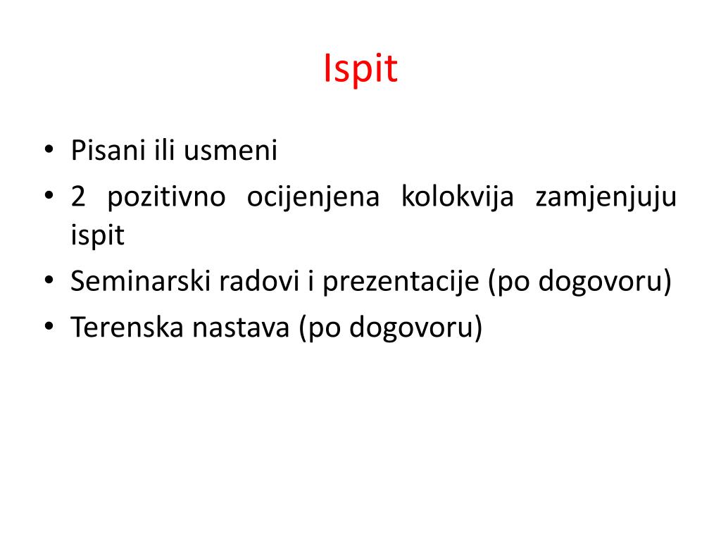 Ispit • Pisani ili usmeni • 2 pozitivno ocijenjena kolokvija zamjenjuju ispit • Seminarski radovi i prezentacije (po dogovoru) • Terenska nastava (po dogovoru)