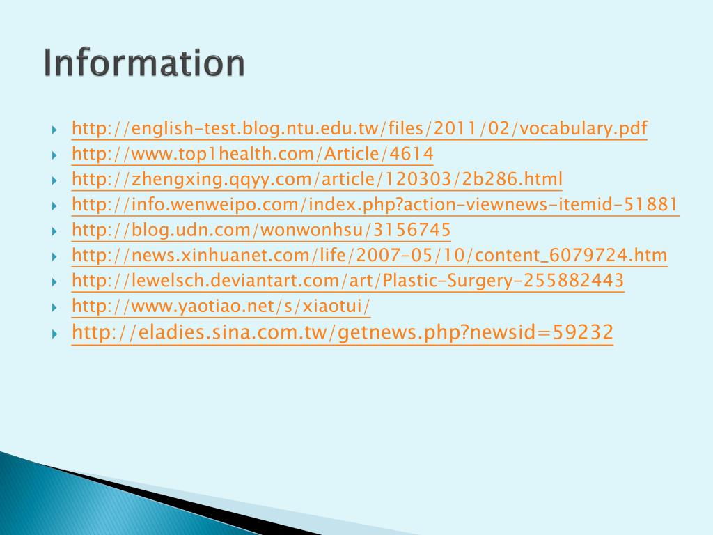 Information • http://english-test.blog.ntu.edu.tw/files/2011/02/vocabulary.pdf • http://www.top1health.com/Article/4614 • http://zhengxing.qqyy.com/article/120303/2b286.html • http://info.wenweipo.com/index.php?action-viewnews-itemid-51881 • http://blog.udn.com/wonwonhsu/3156745 • http://news.xinhuanet.com/life/2007-05/10/content_6079724.htm • http://lewelsch.deviantart.com/art/Plastic-Surgery-255882443 • http://www.yaotiao.net/s/xiaotui/ • http://eladies.sina.com.tw/getnews.php?newsid=59232