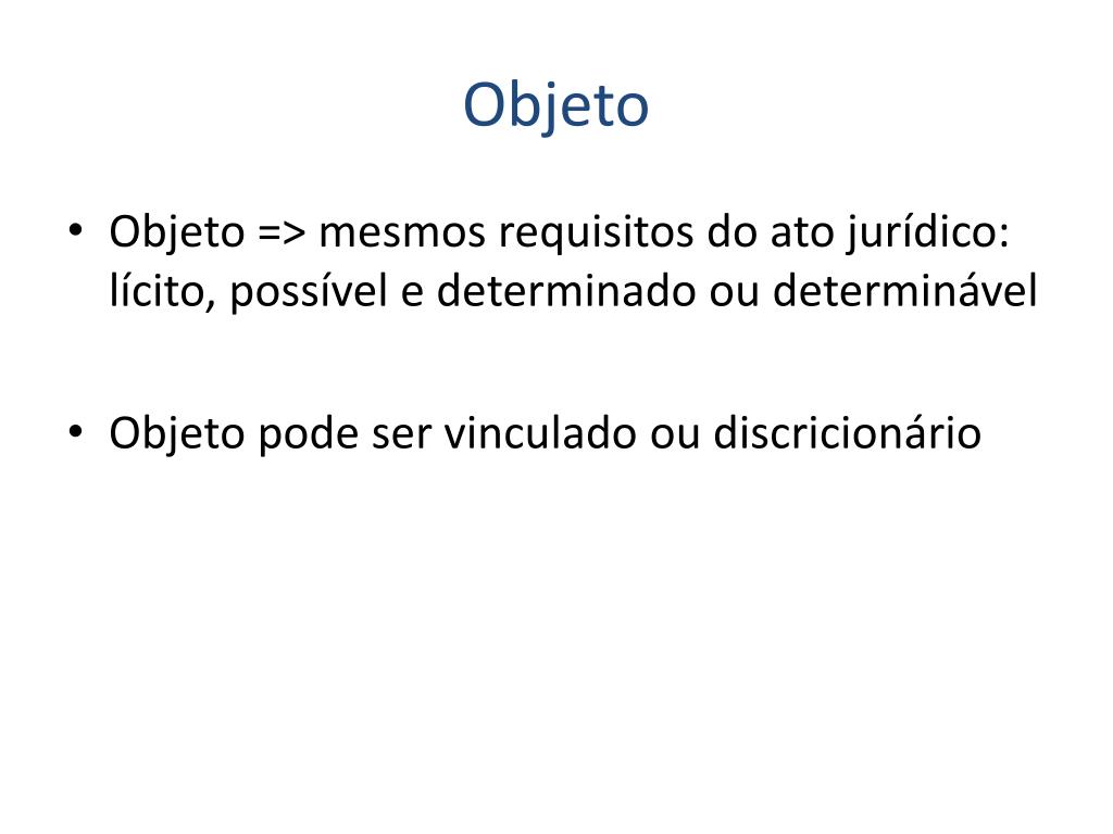 Objeto • Objeto => mesmos requisitos do ato jurídico: lícito, possível e determinado ou determinável • Objeto pode ser vinculado ou discricionário