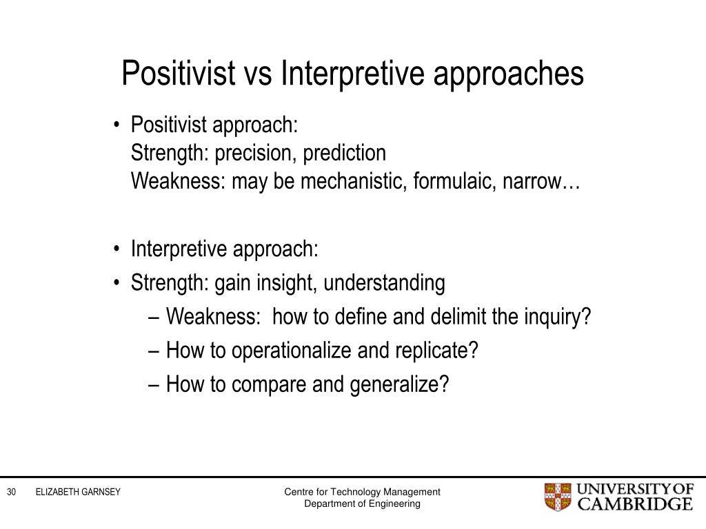 Positivist approach: Strength: precision, prediction Weakness: may be mechanistic, formulaic, narrow… Interpretive approach: Strength: gain insight, understanding Weakness: how to define and delimit the inquiry? How to operationalize and replicate? How to compare and generalize? Positivist vs Interpretive approaches Centre for Technology Management Department of Engineering