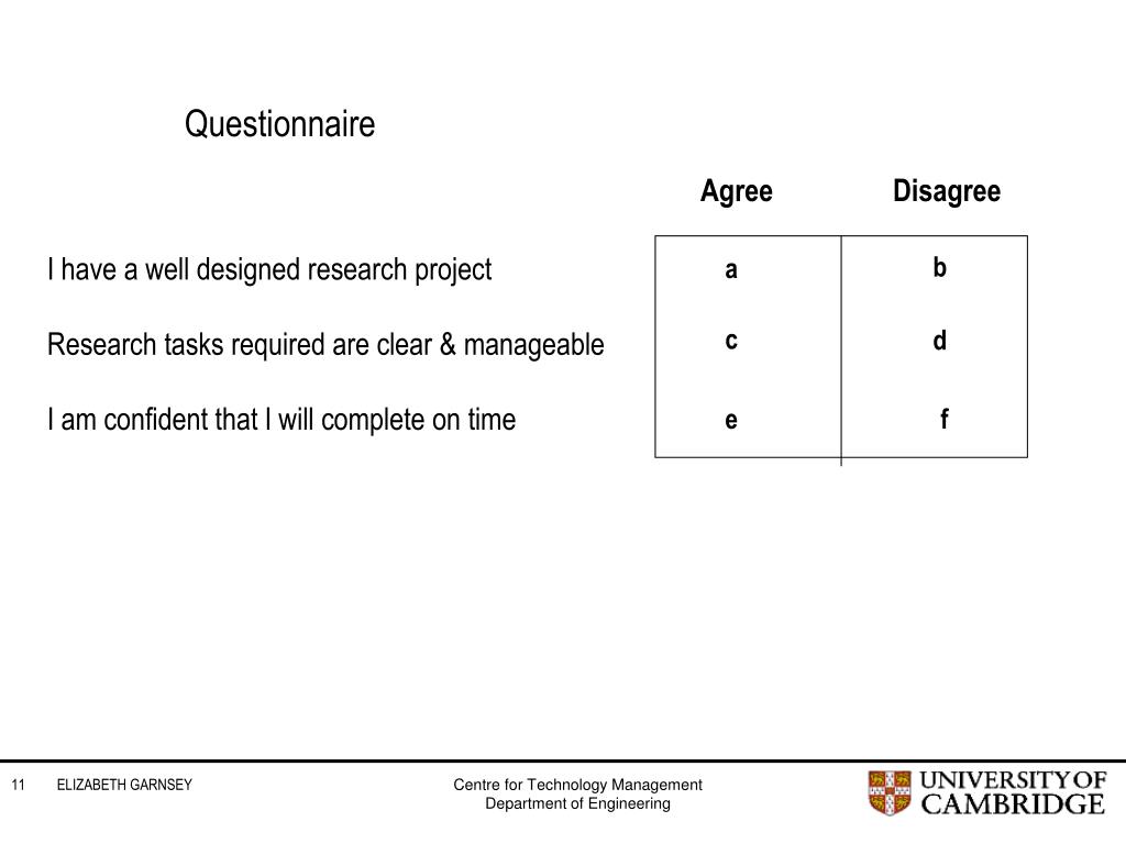 Questionnaire I have a well designed research projectResearch tasks required are clear & manageableI am confident that I will complete on time Agree Disagree b a c d e f Centre for Technology Management Department of Engineering