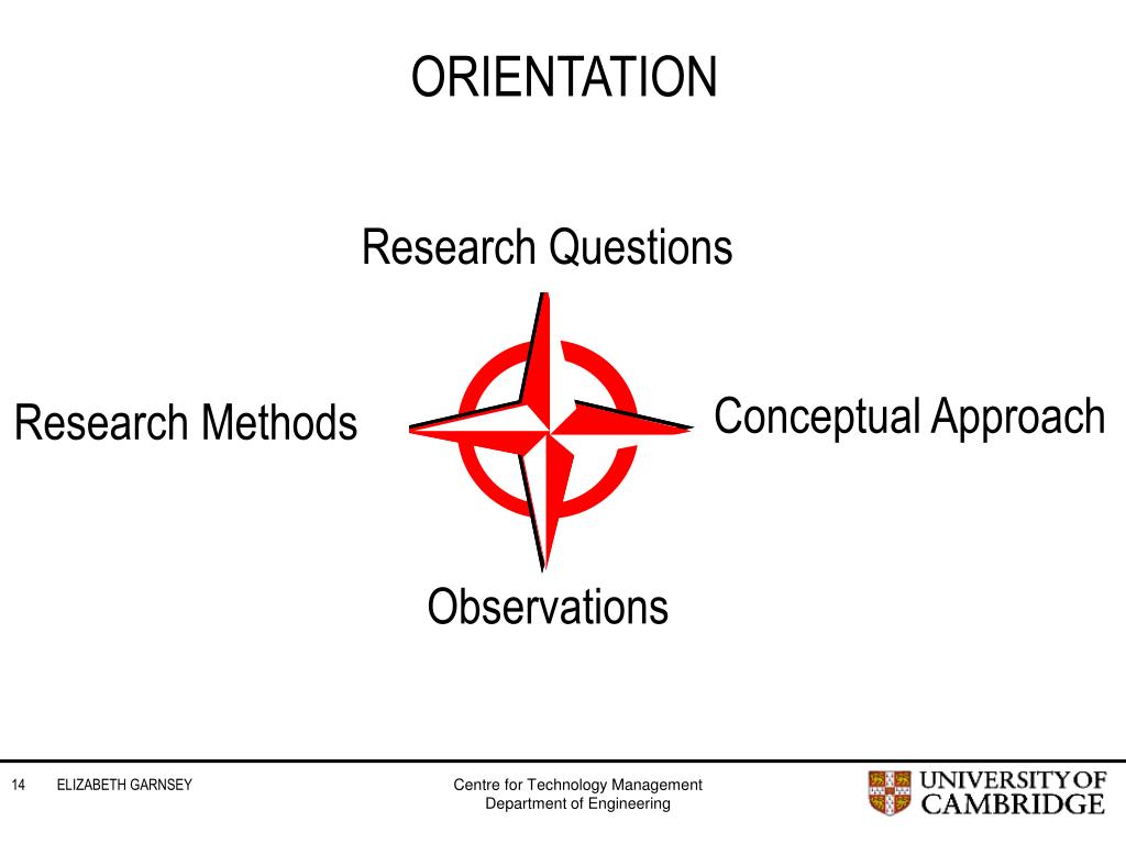 Research Questions Conceptual Approach Research Methods Observations ORIENTATION Centre for Technology Management Department of Engineering