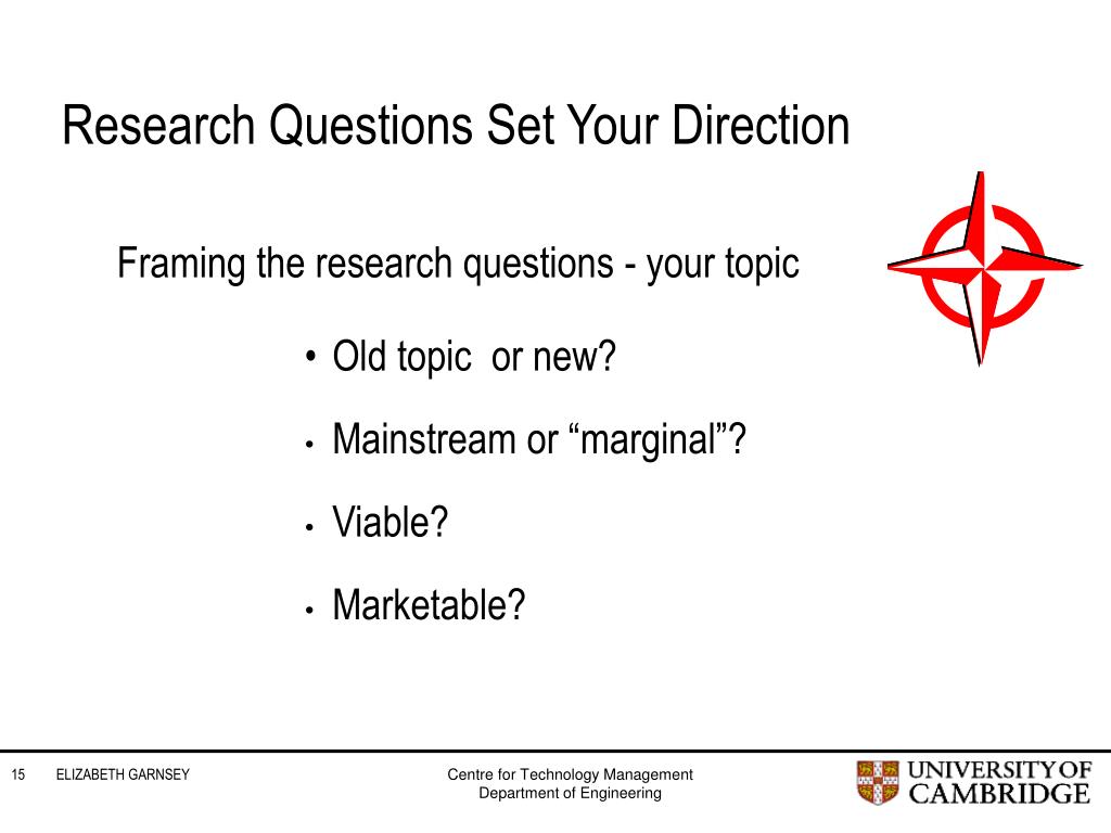 Research Questions Set Your Direction Framing the research questions - your topic • Old topic or new? • Mainstream or “marginal”? • Viable? • Marketable? Centre for Technology Management Department of Engineering