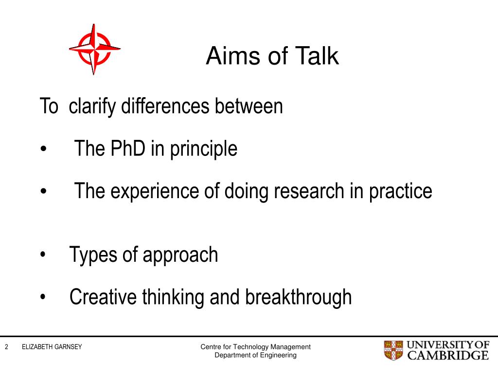Aims of Talk • To clarify differences between • The PhD in principle • The experience of doing research in practice • Types of approach • Creative thinking and breakthrough Centre for Technology Management Department of Engineering