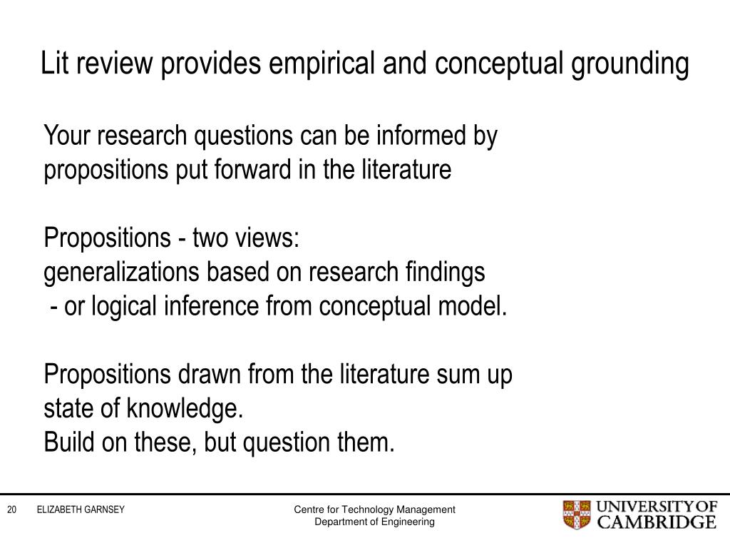 Lit review provides empirical and conceptual grounding Your research questions can be informed by propositions put forward in the literature Propositions - two views: generalizations based on research findings - or logical inference from conceptual model. Propositions drawn from the literature sum up state of knowledge. Build on these, but question them. Centre for Technology Management Department of Engineering