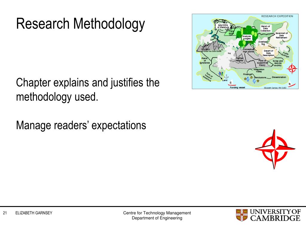 Research Methodology Chapter explains and justifies the methodology used. Manage readers’ expectations Centre for Technology Management Department of Engineering