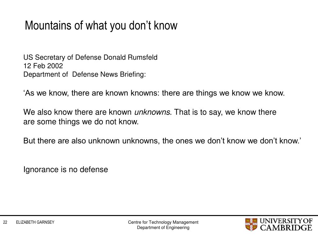 Mountains of what you don’t know US Secretary of Defense Donald Rumsfeld 12 Feb 2002 Department of Defense News Briefing: ‘As we know, there are known knowns: there are things we know we know. We also know there are known unknowns. That is to say, we know there are some things we do not know. But there are also unknown unknowns, the ones we don’t know we don’t know.’ Ignorance is no defense Centre for Technology Management Department of Engineering