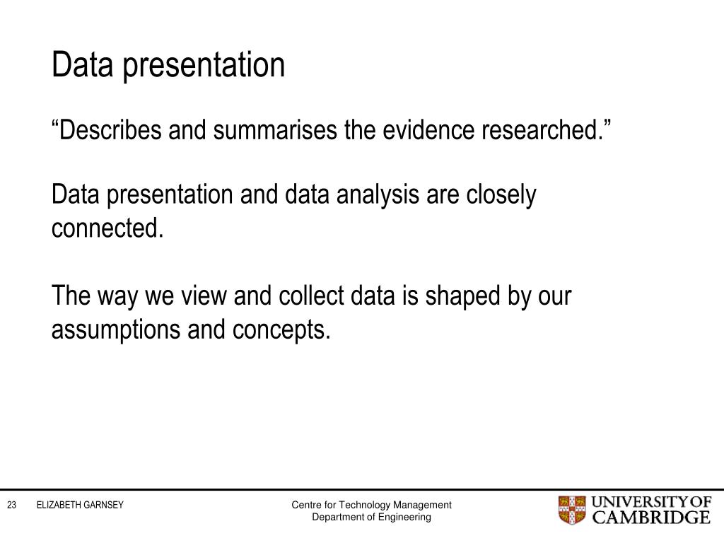 Data presentation “Describes and summarises the evidence researched.” Data presentation and data analysis are closely connected. The way we view and collect data is shaped by our assumptions and concepts. Centre for Technology Management Department of Engineering